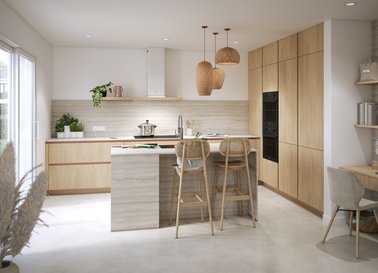 Si dispones de una superficie amplia y abierta al comedor o al salón, una cocina completa con isla es la opción más idónea.