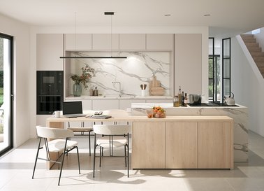 Ahora que tiene una idea más clara del estilo y la distribución de su cocina, es el momento de pensar en el equipamiento más adecuado. Puede crear una cocina totalmente a medida seleccionando los materiales y colores de los revestimientos y las encimeras. Puede personalizar su cocina hasta el más mínimo detalle. Tiradores, fregaderos y grifos monomando: le ofrecemos equipamiento de alto rendimiento para cocinas empotradas. Campanas, frigoríficos y lavavajillas son también algunos de los elementos con los que puede jugar para construir la cocina de sus sueños.