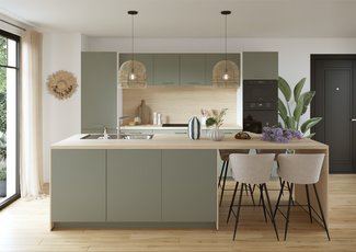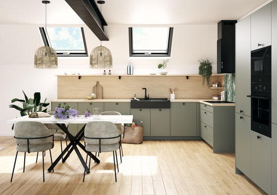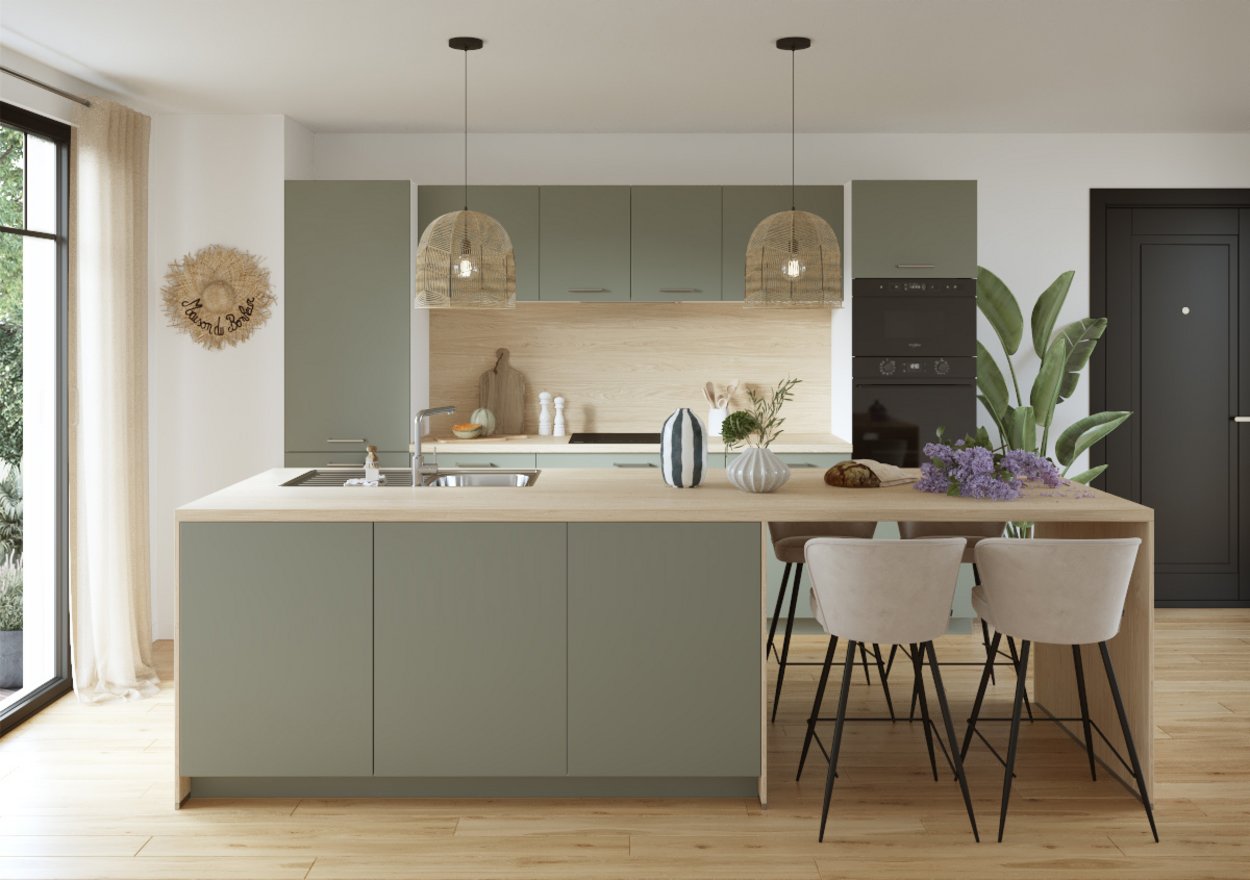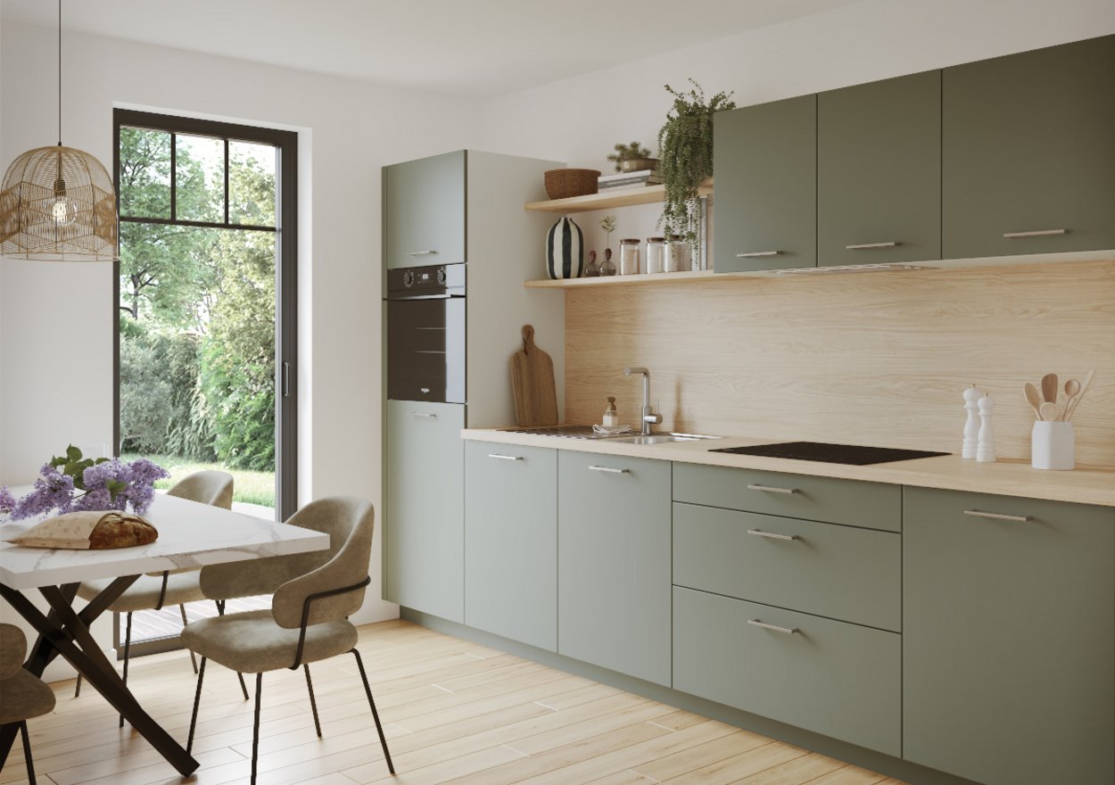 La combinación de verde oliva y madera clara invita a la calma. ¡Dan ganas de meditar entre receta y receta!