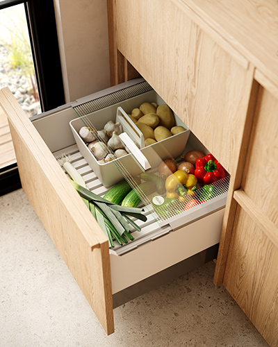 ¡Se acabaron las frutas dando vueltas por la encimera! Discreta y perfectamente integrada, la Pantry-box, de diseño depurado, acoge tus frutas y verduras de uso diario, prolongando su frescura y su vida útil.